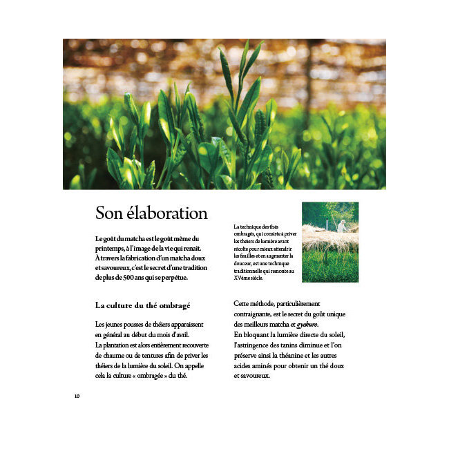 Les jeunes pousses de théiers apparaissent en général au début du mois d’avril. La plantation est alors entièrement recouverte de chaume ou de tentures afin de priver les théiers de la lumière du soleil. On appelle cela la culture « ombragée » du thé. Cette méthode, particulièrement contraignante, est le secret du goût unique des meilleurs matcha et gyokuro. En bloquant la lumière directe du soleil, l’astringence des tanins diminue et l’on préserve ainsi la théanine et les autres acides aminés pour obtenir un thé doux et savoureux.