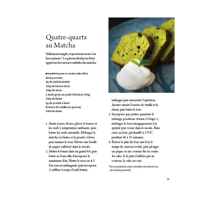 Traditionnellement utilisé pour la cérémonie du thé (Chanoyu), le Matcha est le seul thé dont on boit les feuilles (réduites en poudre) directement, contrairement aux autres type de thés dont les feuilles sont infusées dans l’eau puis jetées. Il est souvent accompagné de petits sucres japonais (appelés Wasanbon) que l’on déguste avant de boire le Matcha pour contrebalancer son amertume. Ce thé en poudre est très riche en catéchines et en acides aminés. Produit à partir de la même famille de feuilles que le thé vert Gyokuro (qui ont été séchées et émiettées pour donner naissance au Tencha), le Matcha est un thé vert Tencha que l’on a réduit en poudre avec une meule en pierre.