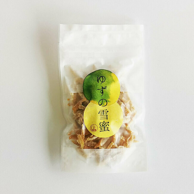 Écorce de yuzu lentement trempée dans de la mélasse afin de créer un effet de fruits secs. Idéal pour accompagner votre thé ou comme en-cas avec le vin.