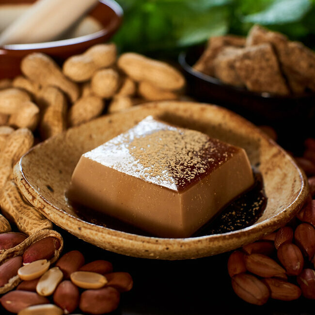 Dessert japonais à base de pâte d’arachides et à la texture légèrement élastique, semblable au tofu. Il est accompagné d’une poudre de soja à saupoudrer dessus. Très soyeux et frais en bouche, il viendra terminer à merveille vos repas ou vos pauses gourmandes.