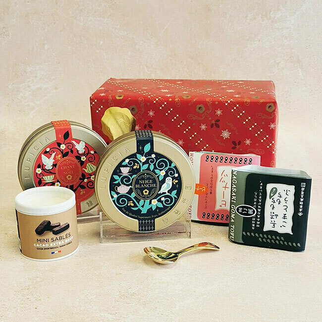Ce coffret de Noël regroupe deux de nos créations gourmandes accompagnées de déliceux desserts japonais : 1 tôfu au sésame noir et 1 tôfu à la cacahuète et des sablés au cacao.